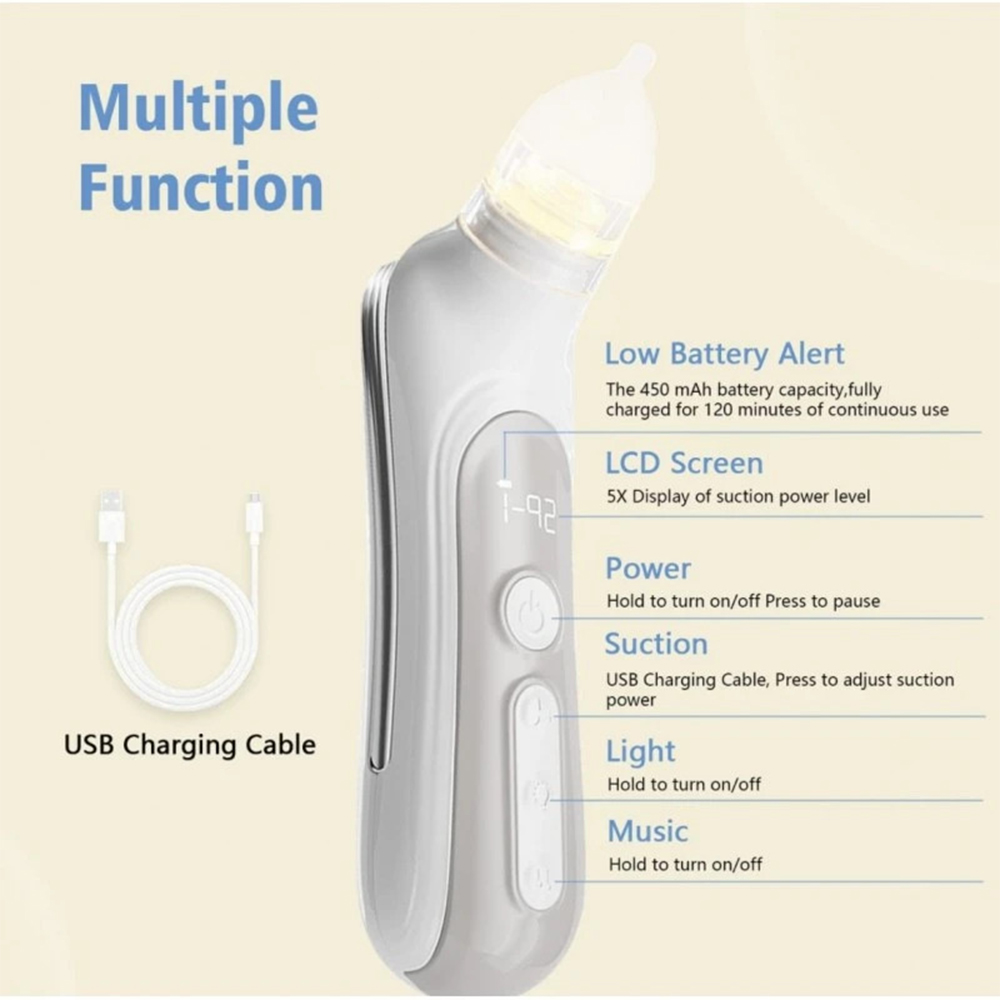 - دارای موسیقی دلپذیر و جلوه های نوری در قسمت مکنده بطوریکه در زمان انجام مکش ، موزیک و نورهای رنگی متغییری پخش می شود و حواس کودک را به خود جلب میکند تا والدین بتوانند براحتی مخاط بینی را خارج کنند