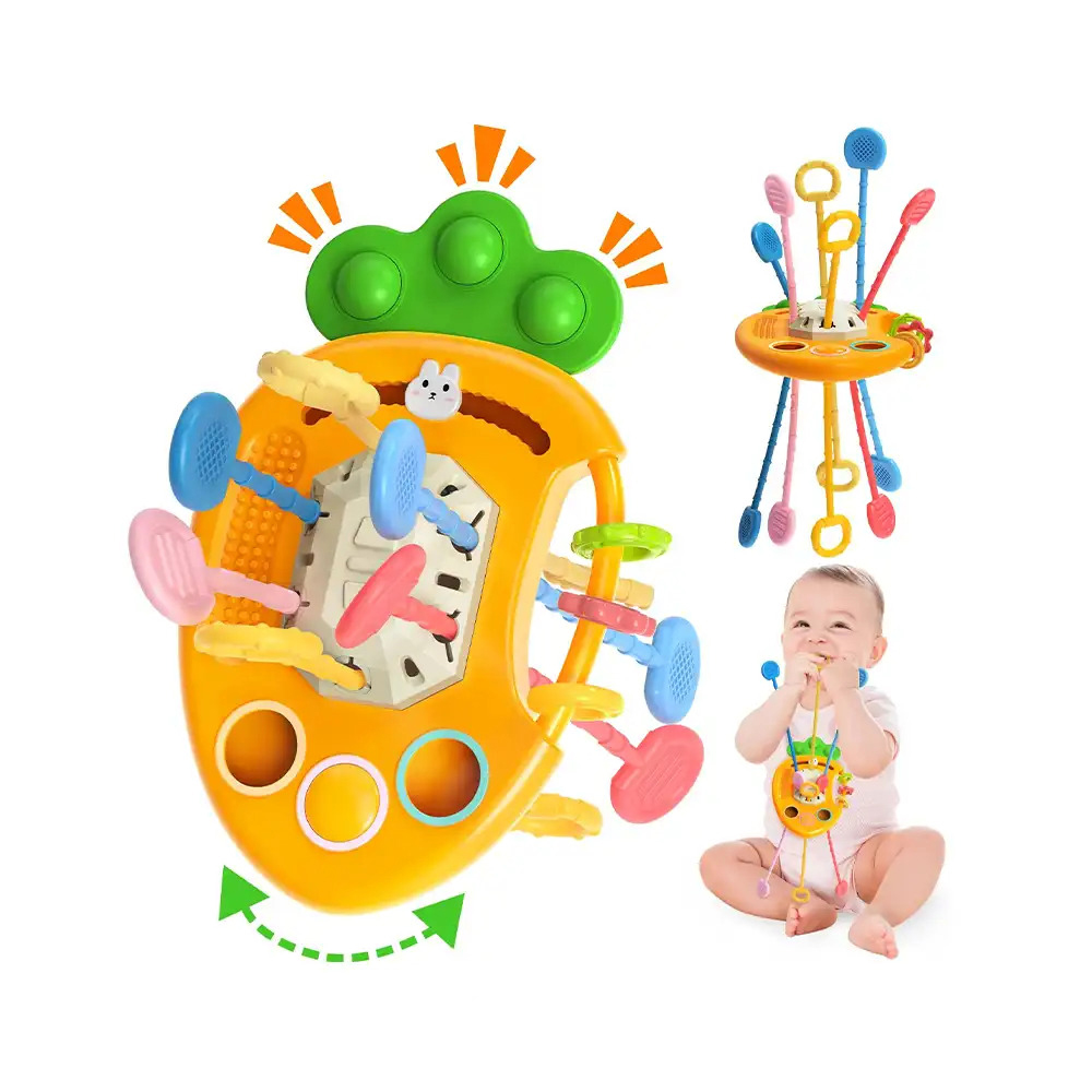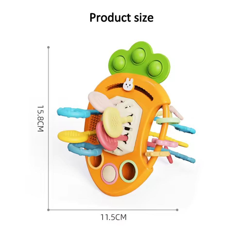 - همچنین در بخش میانی هویج، نخهایی رنگی تعبیه شده که کودک میتواند آنها را یکییکی بیرون بکشد. این کشیدن نخها باعث تقویت مهارتهای حرکتی ظریف، تمرکز و هماهنگی بین چشم و دست میشود