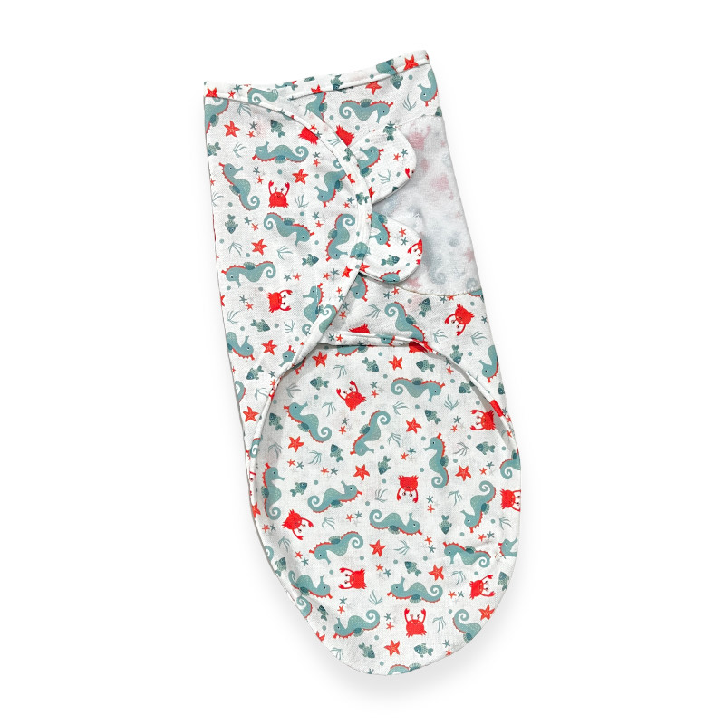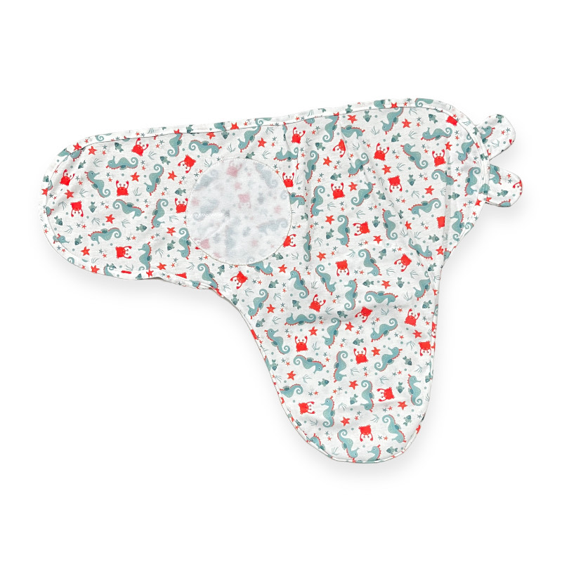 - در انتها، دست راست نوزاد را نیز به سمت پایین بگذارید، سمت راست قنداق را روی نوزاد بکشید و چسب ها را سفت کنید