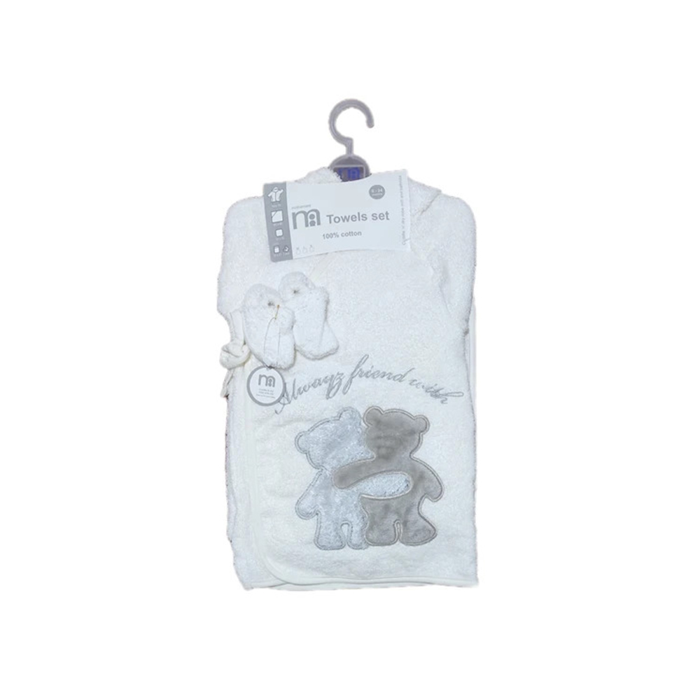 - این ست شامل حوله تن پوش، حوله دورپیچ کلاه دار، لیف و یک جفت پاپوش نوزادی است